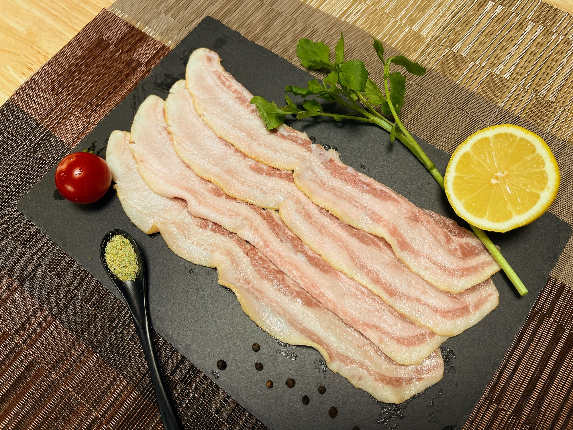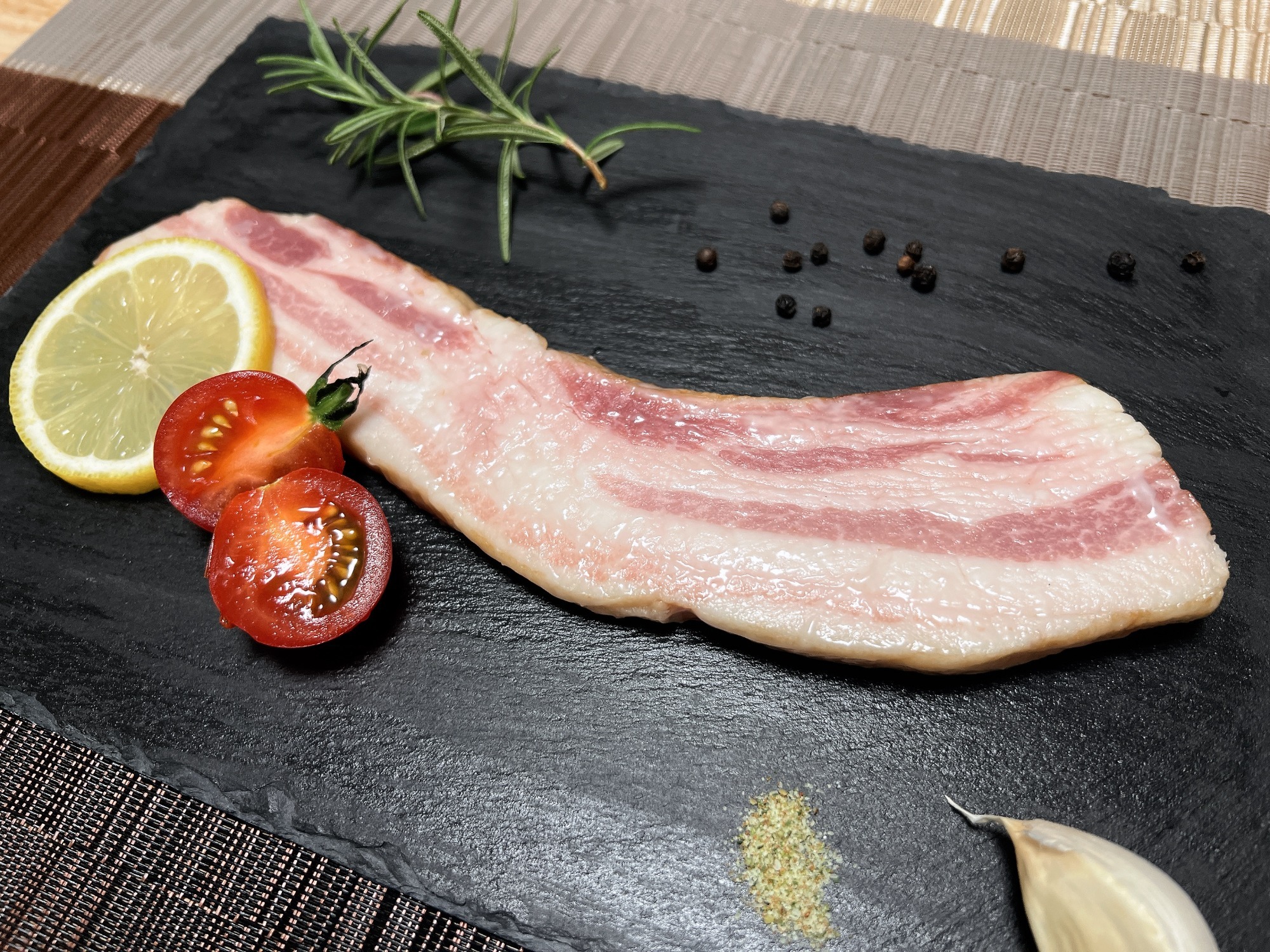 低融点脂が特徴のバラ肉を使ったベーコン。表面をサッと焼くと脂がさらりととろけ、しつこさを感じさせないさっぱりとした深い味わいです。