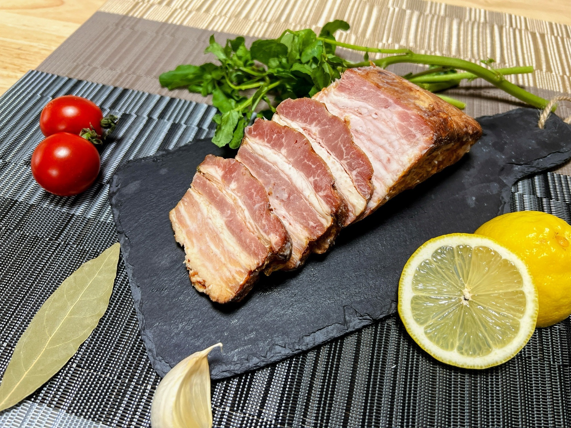 低融点脂が特徴のバラ肉を使ったベーコン。お好みの大きさに切って炒め物やパスタ、そのままステーキにしても良し。炙る程度に火を入れ、焼過ぎないのがおすすめ。